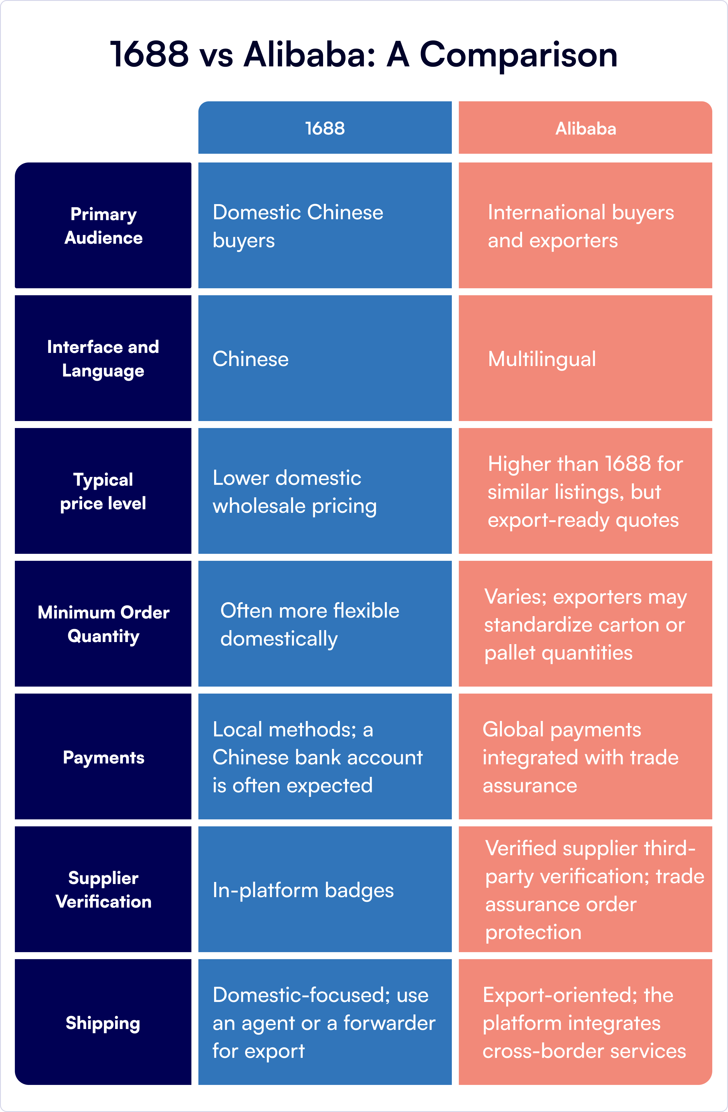 1688 often means lower local factory pricing but more complexity for overseas buyers (language, payment, export).