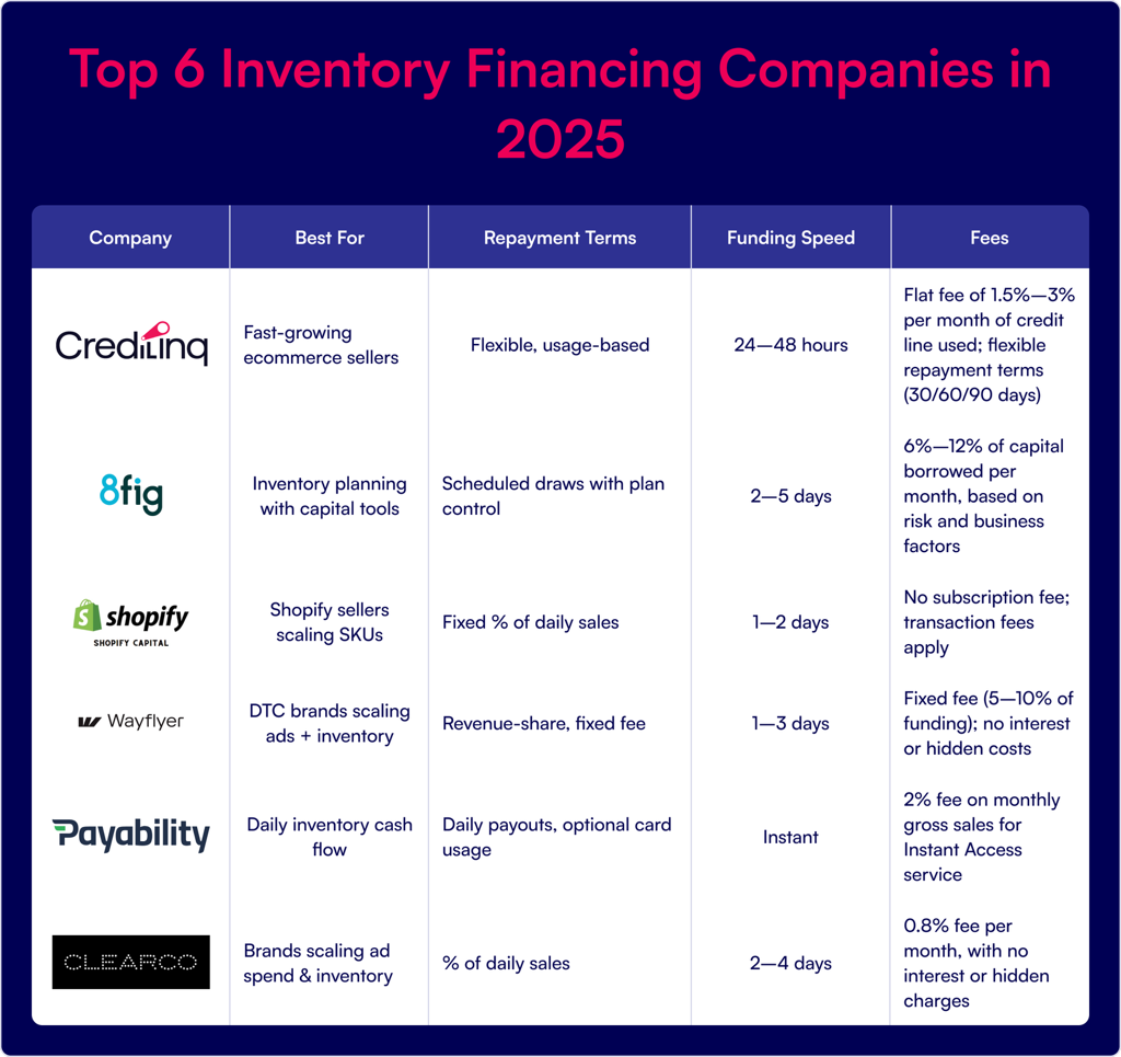 - Top inventory financing companies in 2026 include CrediLinq, Wayflyer, 8fig, Payability, Shopify Capital, and Clearco
